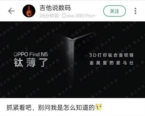 而Find N5作为2025年的第一款大折叠,则是决定在轻薄的赛道上内卷到底。从微博及酷安等社区曝光的信息来看,Find N5将采用3D打印技术制造的钛合金铰链,将折叠状态的厚度做到了10mm以下,更有消息称Find N5将会是全球「最薄」的大折叠,也就意味着其厚度将小于Magic V3的9.2mm。