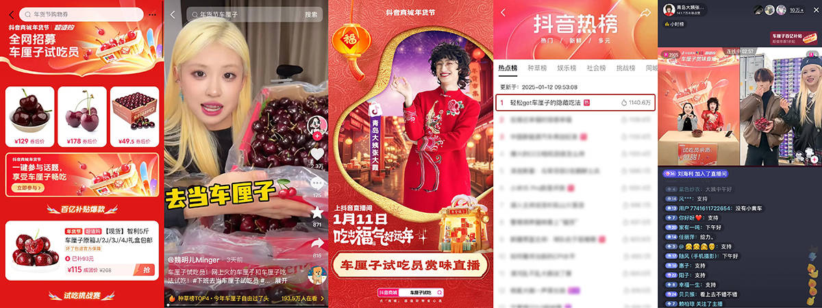 数据显示,「吃出福气好运年」品类日营销热度爆发,活动整体话题曝光量达13亿,主话题腊八美食图鉴 下班去当车厘子试吃员、轻松get车厘子的隐藏吃法 3个热点话题分别登上抖音种草榜TOP4、TOP3、TOP1&总榜TOP1。成功招募的10大素人试吃员还走进商家、达人直播间,连麦打爆活动热度。车厘子品类同比去年同季增长149%,成功打造“上抖音买车厘子”心智。