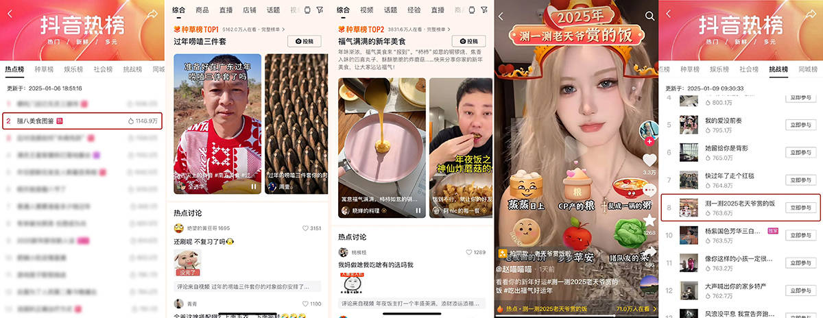 品类日期间,与新年食饮相关的热点话题层出不穷,每日一热点,助力商家生意爆发。活动累计投稿量4.5万+,登上抖音热榜14次,最高登热榜TOP1&种草榜TOP1,最高1天有7个热点,南北方办年货区别这么大吗 登上热榜TOP4,还有其他多个上榜热点如 福气满满的新年美食。活动期间上线的短视频挑战赛「测一测2025老天赏的饭」,吸引大量用户参与互动,相关话题位居抖音热榜TOP32,挑战榜TOP8,并同步带动看后搜增长,搜索PV爆发631%。
