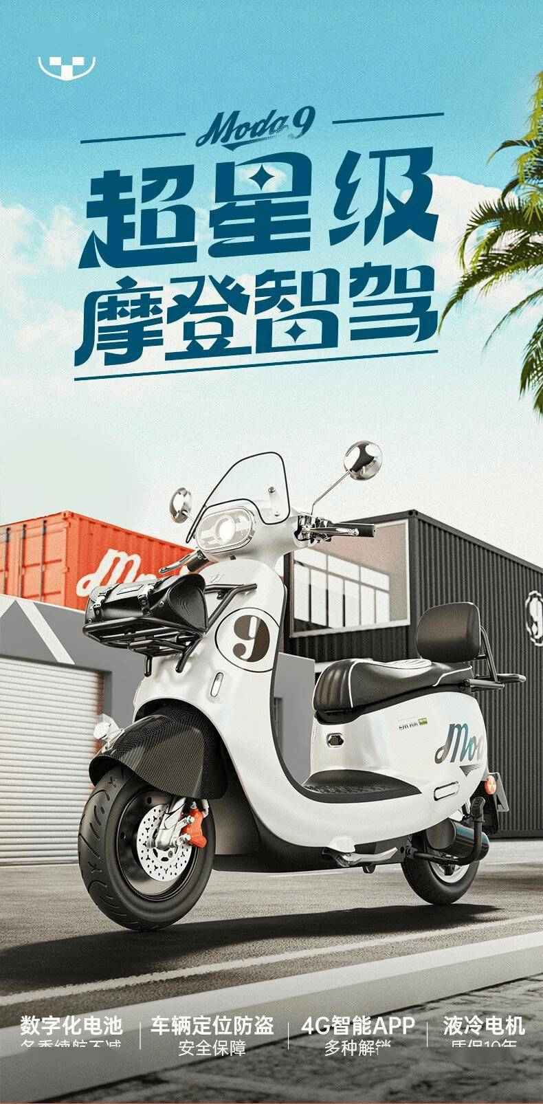 在动力方面,Moda9搭载了1kW的液冷电机,并配备了12管控制器,为用户提供三档变速选择,最高时速可超过50km。电池方面,该车采用了60V 23Ah的电池组,并配备了数字化的电池养护系统,确保电池性能稳定,质保期长达三年。