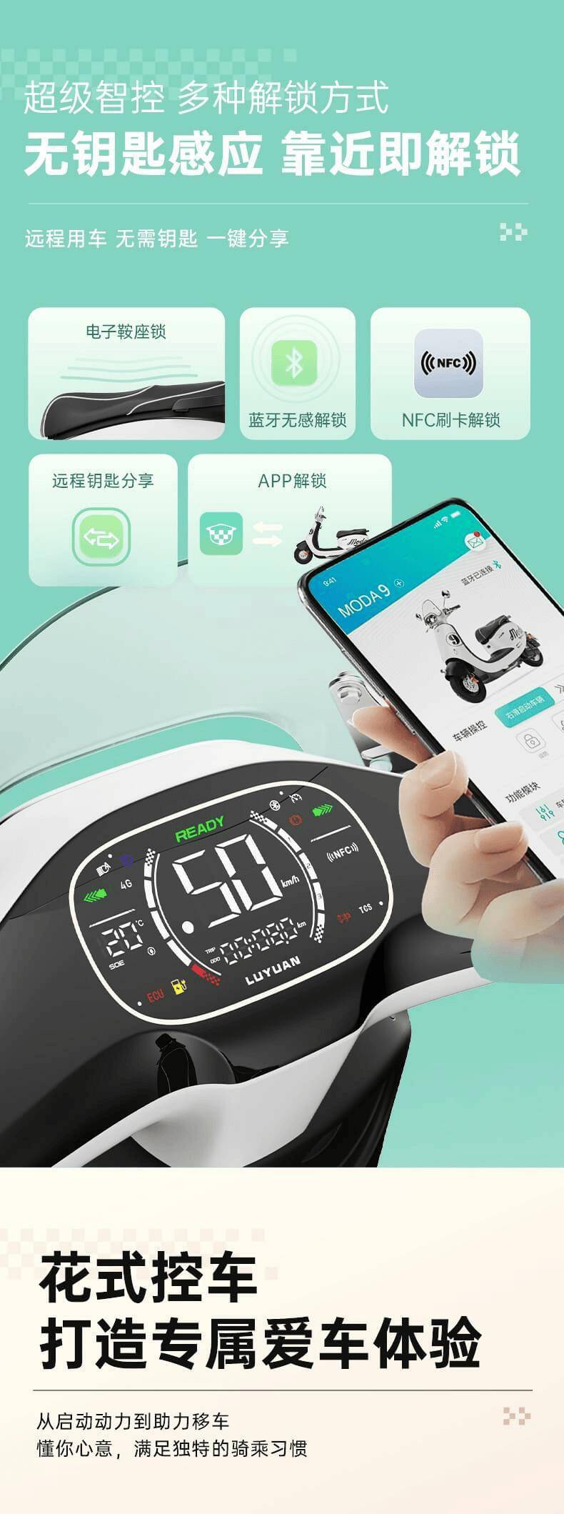 智能化方面,Moda9支持手机App控制,用户可以通过手机进行车辆定位、设置电子围栏、无钥匙感应等操作。该车还支持全智能4G系统,可以远程OTA升级,确保车辆始终保持最新状态。在定位方面,Moda9采用了GPS、北斗、基站三模定位技术,提供更加精准的定位服务。