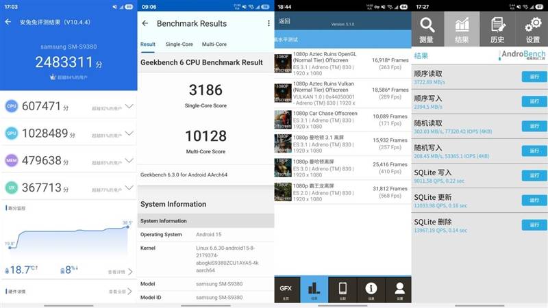 最后我们也对手机进行了闪存性能测试,Androbench内存测试中,三星Galaxy S25 Ultra的UFS 4.0的顺序读写速度,分别来到了3.7GB/s、2.4GB/s,随机读写也有302.03MB/s、208.45MB/s的速度。
