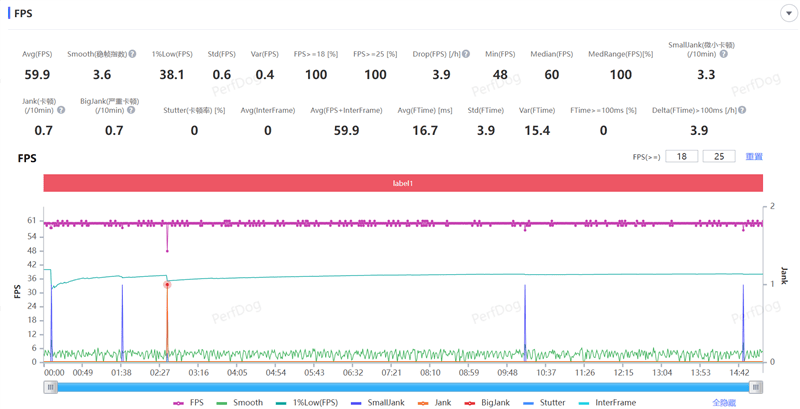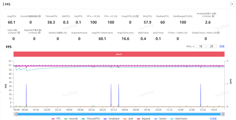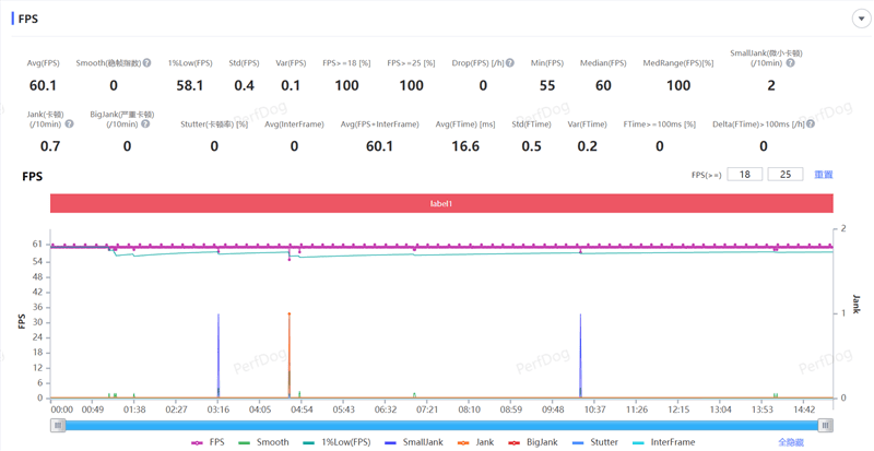 首先是低负载的王者荣耀手游测试,极致画质下可开启高帧(60帧)模式,一局5V5团战后平均帧率稳定60.1FPS输出,平均波动为0。