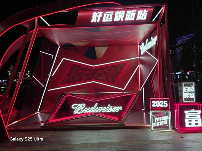夜景下,使用手机的夜景模式进行长曝光拍摄,三星Galaxy S25 Ultra能够真实呈现建筑的原始面貌,即使将商场广告牌放大观察,也能细致地分辨出每一处细节,这充分展示了它在应对强光环境下的卓越控制力。