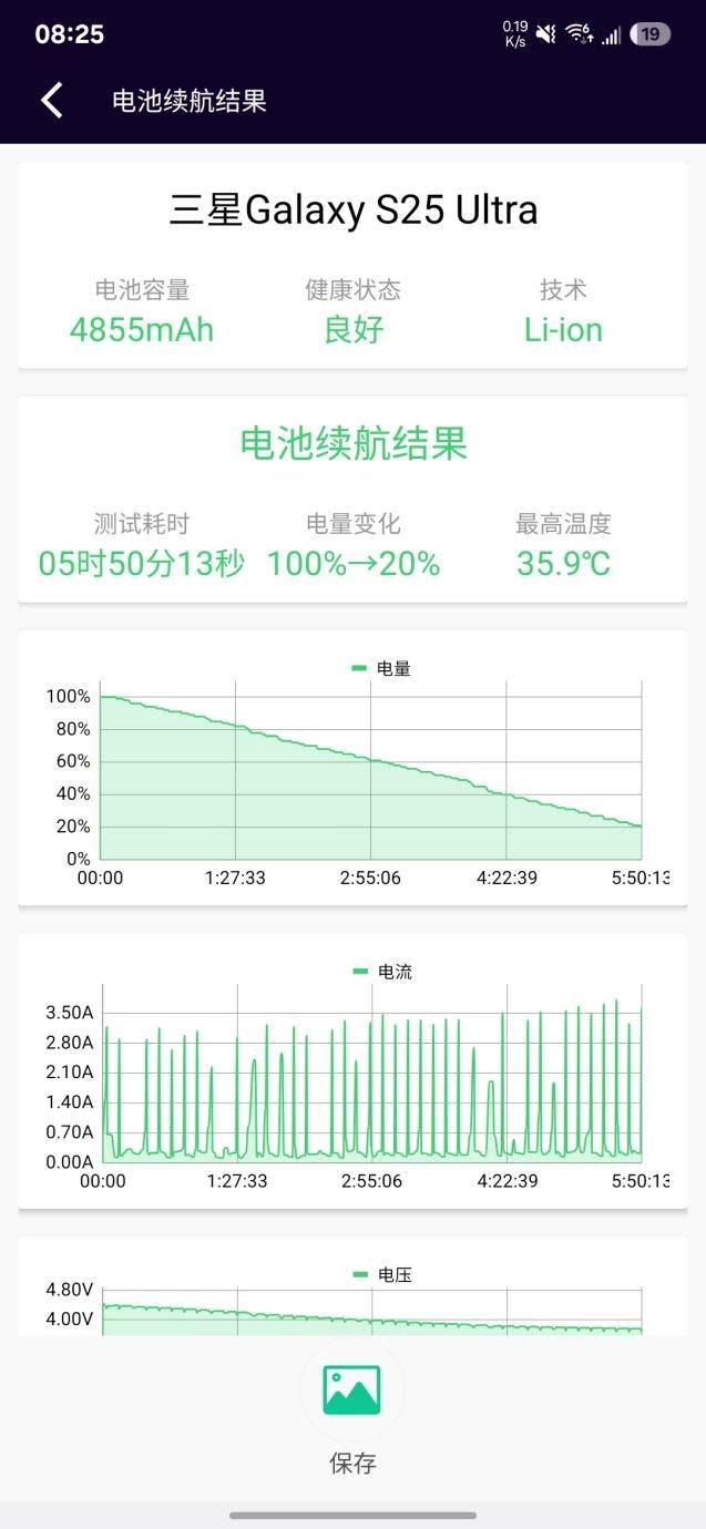 经过电池狗狗不间断测试,三星Galaxy S25 Ultra的电量从100%消耗至20%,用时5小时50分13秒,经过折算,满电续航可以达到接近7.5个小时,这样的续航成绩可以满足普通用户一天的使用时长。