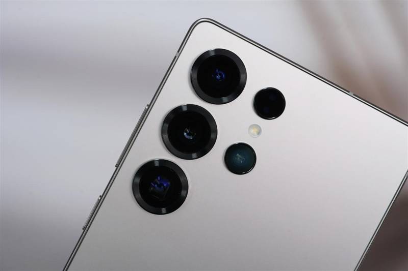 S25 Ultra后置四颗镜头与一颗激光对焦模组,位于居左位置,凸起并不算严重,相比前代,镜头边缘的装饰圈被涂成黑色,但是从侧边观察,镜头圈则与机身的配色保持一致,整体设计更加协调统一。