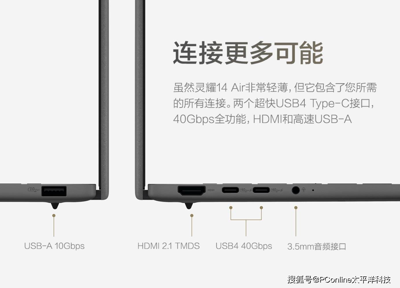 机身两侧也未牺牲接口实用性,两个超快USB4 Type-C接口支持40Gbps高速数据传输及PD充电,可使用手机充电器、充电宝为其充电,还有HDMI 2.1 TMDS和高速USB-A、3.5mm音频接口,传输数据、连接显示屏/鼠标等外设更方便。