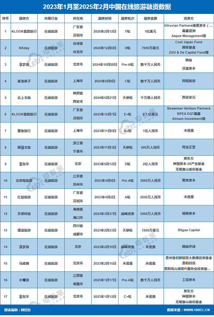 据“电数宝”电商大数据库显示,2023年1月至2025年2月,国内在线旅游领域共发生了17起投融资事件,融资总额约31.6亿元,涉及的公司包括:KLOOK客路旅、KKday、享梦游、麦淘亲子、云上文旅行、墨鱼旅行、国慧文旅、皇包车、乐启程旅游、红蚁旅游、友邻伴旅、理途旅游、享梦游、马蜂窝、小鹭游。