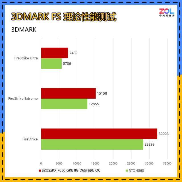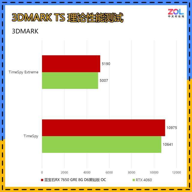 而在针对DX12环境下的Time Spy和Time Spy Extreme测试中,蓝宝石RX 7650 GRE 8G D6黑钻版OC相较RTX 4060的提升分别为TS 3%/TSE 4%。