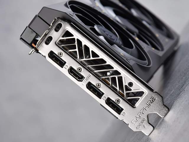 蓝宝石RX 7650 GRE 8G D6黑钻版OC的整卡厚度为2槽,视频输出接口采用了HDMI 2.1*1+DP 1.4*3的设计。
