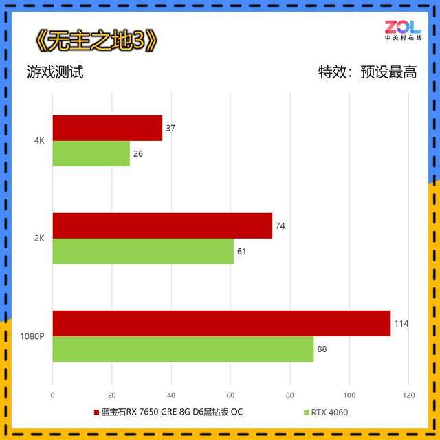 蓝宝石RX 7650 GRE 8G D6黑钻版OC相较RTX 4060在2K分辨率下的差距为27%。