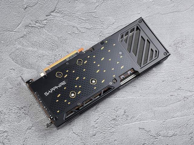 蓝宝石RX 7650 GRE 8G D6黑钻版OC显卡背部采用一体式金属背板,可保护PCB的同时加强散热,尾部有大面积镂空部位辅助快速散热。