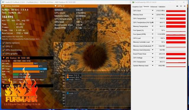 蓝宝石RX 7650 GRE 8G D6黑钻版OC在1小时左右的满载拷机中,温度稳定为72℃,风扇转速16%(1116 RPM),功耗为205W。
