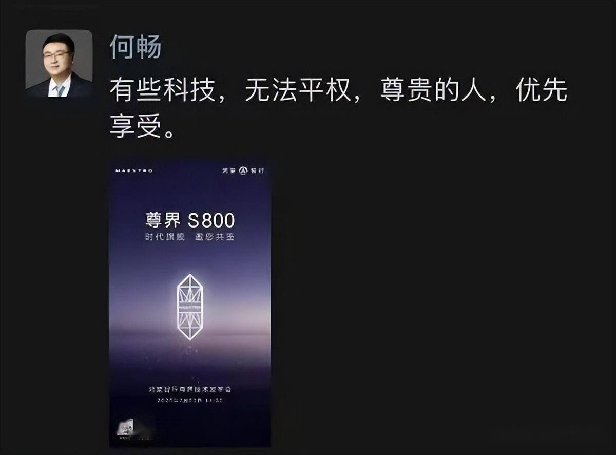 近日,一张关于“平权”的朋友圈截图在网上广为流传。图中,一位署名“何畅”的职场人声称:有些科技,无法平权,尊贵的人,优先享受。文末还配上了尊界S800的发布会海报。