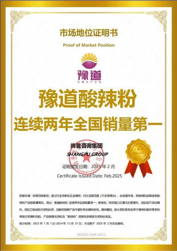 记者了解到,尚普咨询集团通过行业专家和企业调研,对比全国范围(不含港澳台)、全渠道市场、各酸辣粉品牌速食酸辣粉产品在2023年1月1日—2024年12月31日销售量情况,向豫道农业颁发了“连续两年全国销量第一”的市场地位证明书。