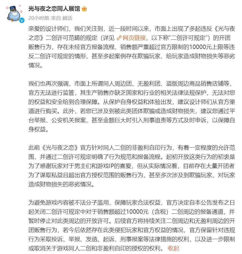 此事过后,腾讯《光与夜之恋》官方调整了二创授权,原本官方开放了二创周边,规定销售额超过10000元(含税)需进行报备,但在经过玩家被骗事件之后,官方彻底关闭了二创周边的报备通道,一刀切了盈利性质的周边。