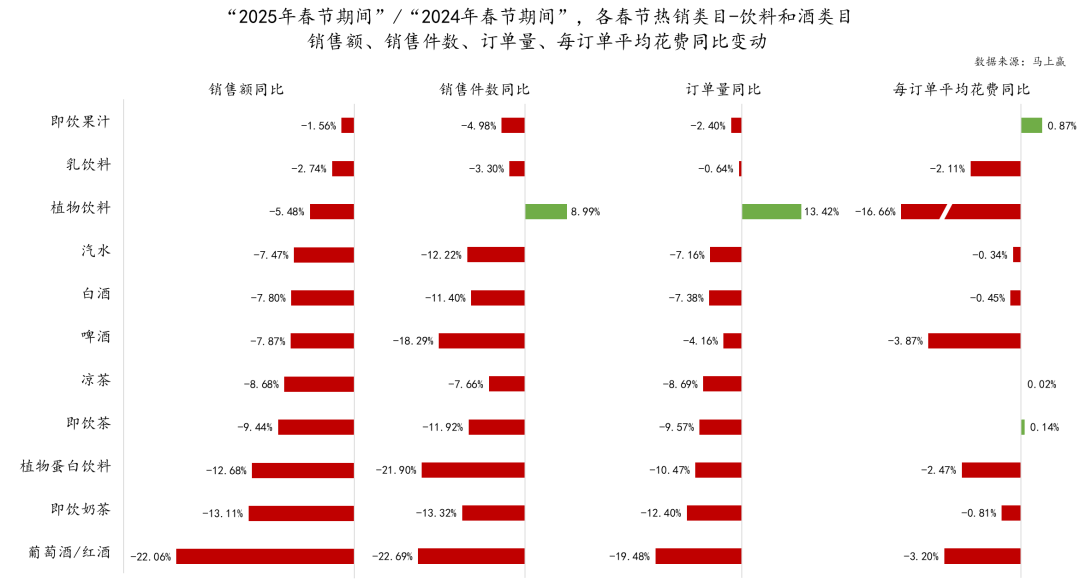 在饮料和酒类目中,即饮果汁的表现相对较好,其销售额同比下滑幅度最小,且每订单平均花费有所增长。这可能与消费者对即饮果汁的需求升级有关。而葡萄酒/红酒类目的同比下滑则较为明显,这可能与消费者民族自豪感的提升和本土文化自信的增长有关。
