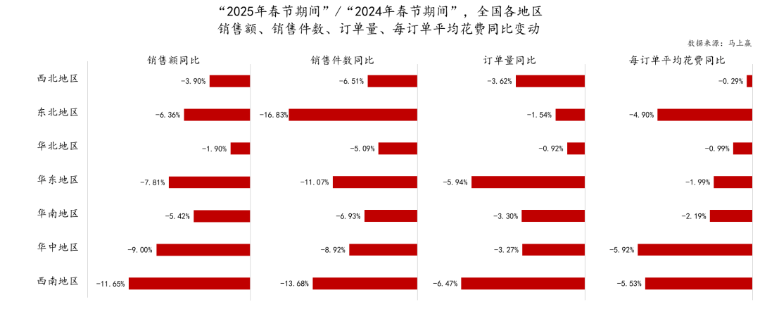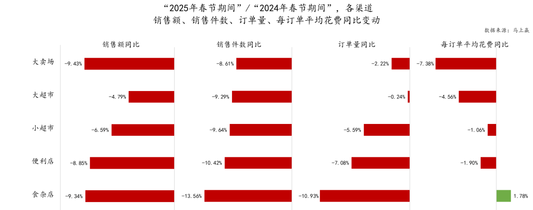 从整体观察来看,2025年春节期间,线下零售市场的销售额、销售件数、订单数量和订单平均花费均呈现小幅度的同比下降,降幅均在10%以内。这一趋势表明,尽管消费市场面临一定压力,但消费者的购物频次和单次消费预算基本保持平衡。