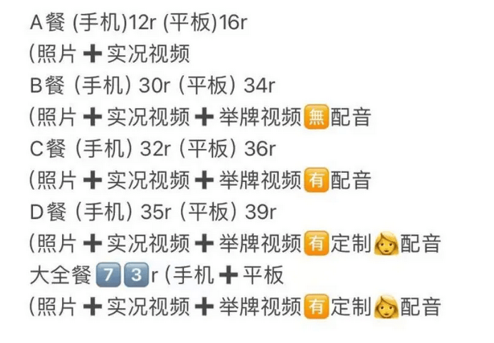在这么多举牌形式的同时,会针对部位和内容,对应不同的价格。其中最贵的可想而知,自然是“胸举”和“私密处举牌”了,价格在40-350元不等。