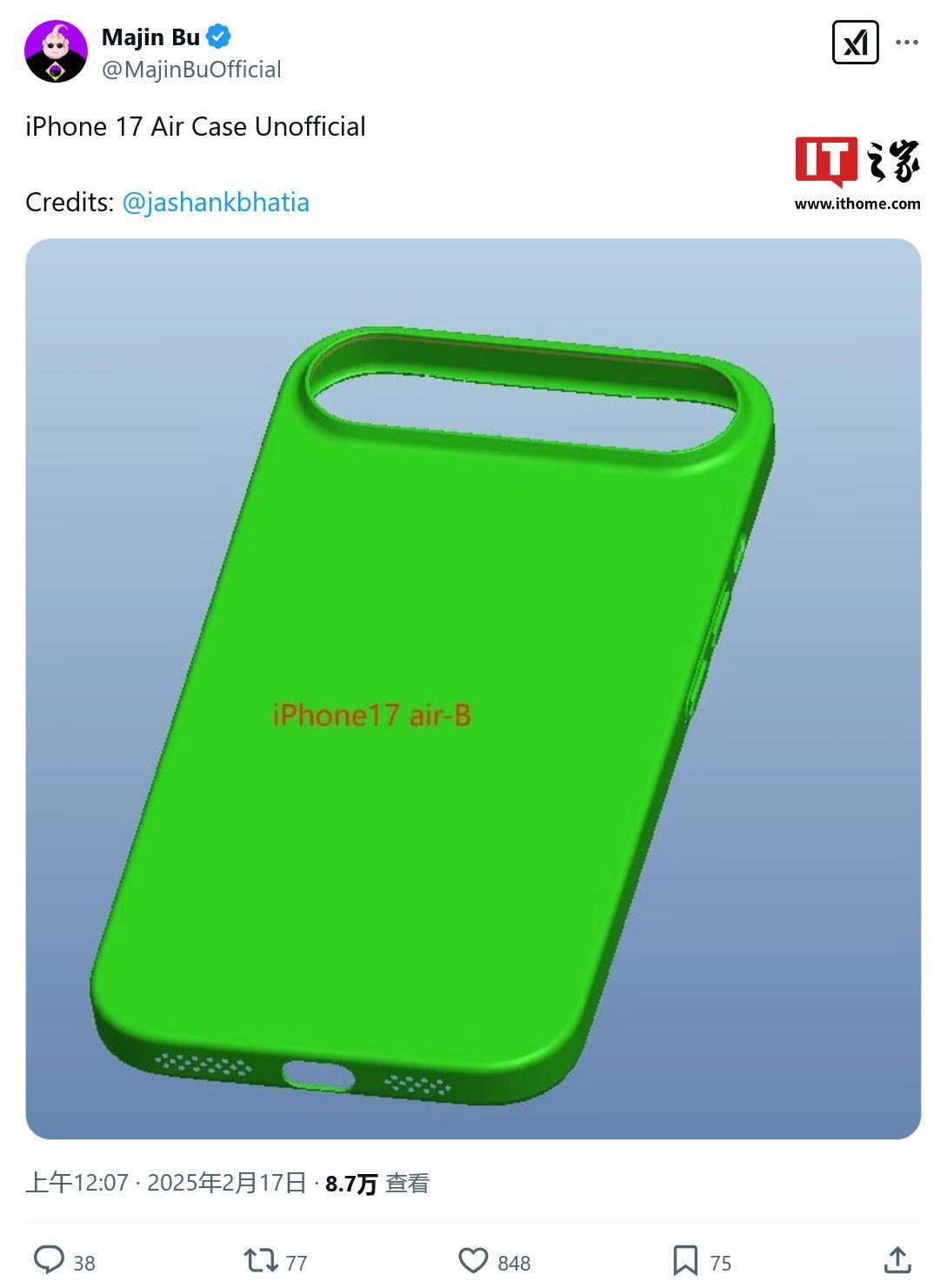 2 月 18 日消息,消息源 @MajinBuOfficial 昨日(2 月 17 日)在 X 平台发布推文,分享了苹果 iPhone 17 Air 和 iPhone 17 Pro 手机壳渲染图。