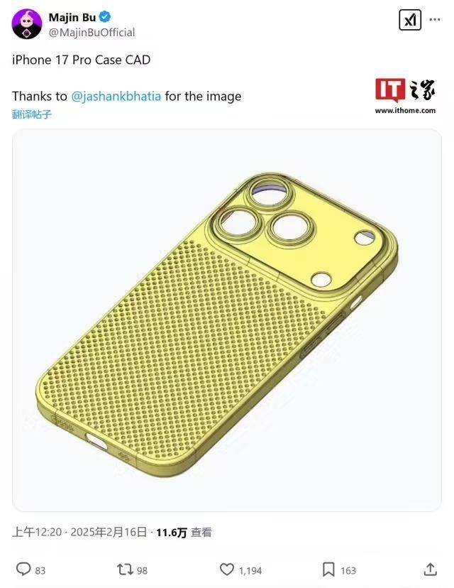 在分享 iPhone 17 Air 的手机壳渲染图之余,@MajinBuOfficial 还晒出了两张有关 iPhone 17 Pro 的图片。