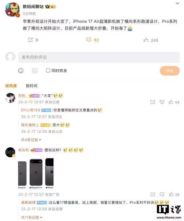 据微博博主昨日(2 月 17 日)发文透露:“ 苹果外观设计开始有较大幅度调整”,其中“iPhone 17 Air 超薄新机做了横向条形跑道设计,Pro 系列做了横向大矩阵设计,目前产品线新增大折叠。”