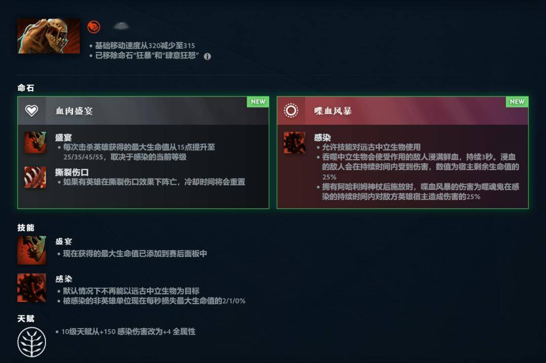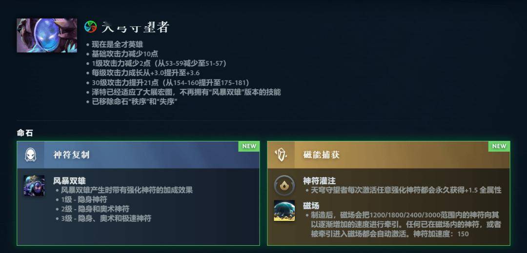 全才英雄得到平衡调整,现在全才英雄的每点属性提供攻击力从 0.7 减少至 0.45,相应的很多英雄的基础攻击力和属性成长有所改变。独行德鲁伊、狼人、凤凰、发条技师等英雄不再是全才英雄;天穹守望者、死亡先知、幽鬼等英雄加入全才英雄。