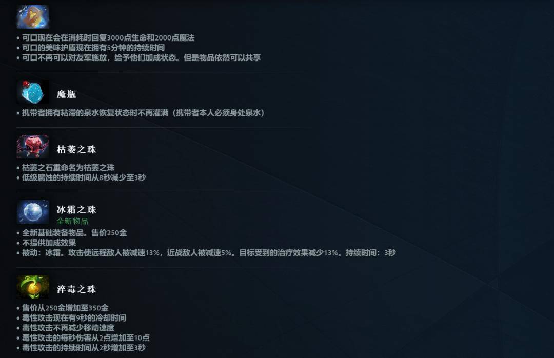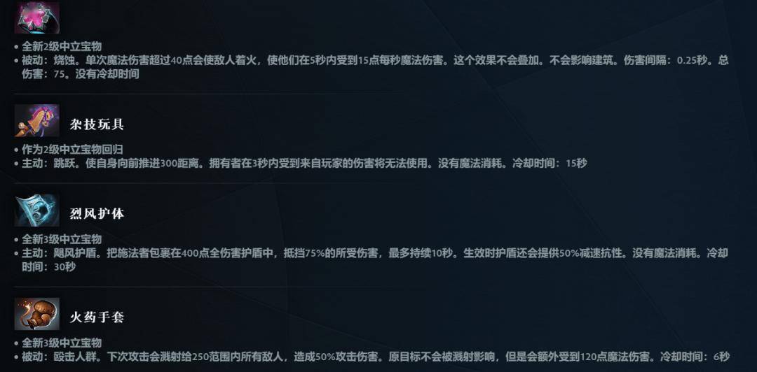 飞贼之刃、精华指环、杂技玩具、天崩、恶牛角、网虫腿等物品作为中立宝物回归,还有一些中立物品在成为中立宝物时行了平衡性修改。