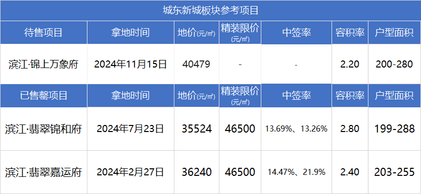 值得注意的是,京漾东韵府西侧的就是2024年11月15日出让的城东新城首宗不限房价地块,40479元/㎡的拿地价在当时创下板块纪录,案名为滨江·锦上万象府,预计新房首开价格会在6万元/㎡以上,将于今年一季度入市。