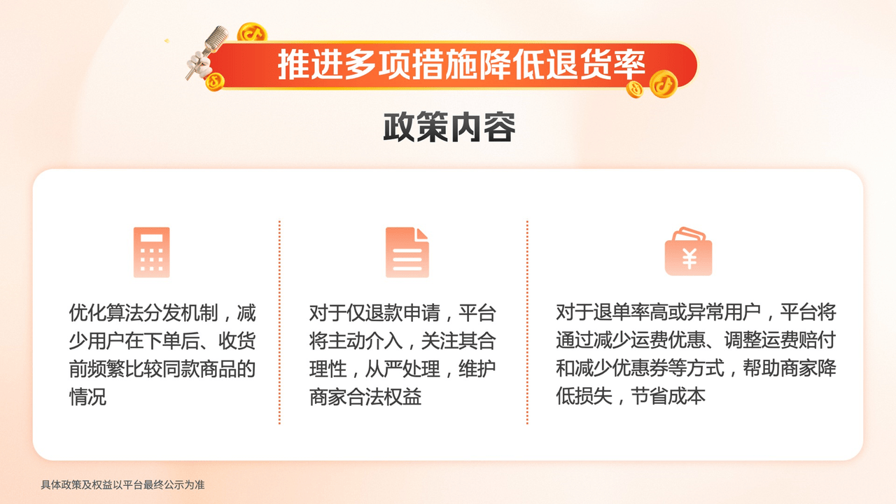 例如,对于退单率高或异常用户,平台将减少运费优惠、调整运费赔付和减少优惠券等,帮助商家降低成本。对于仅退款申请,平台将主动介入,关注其合理性,从严处理。