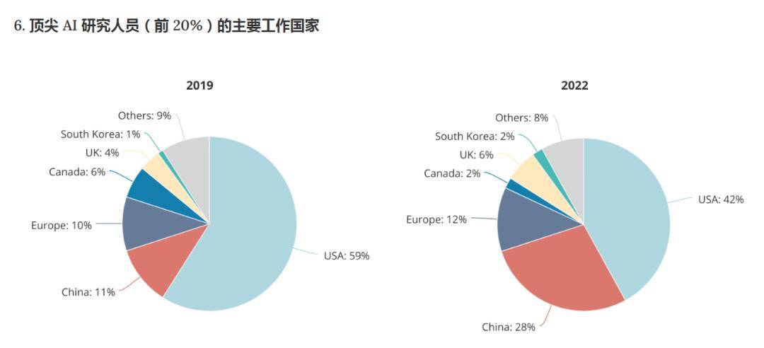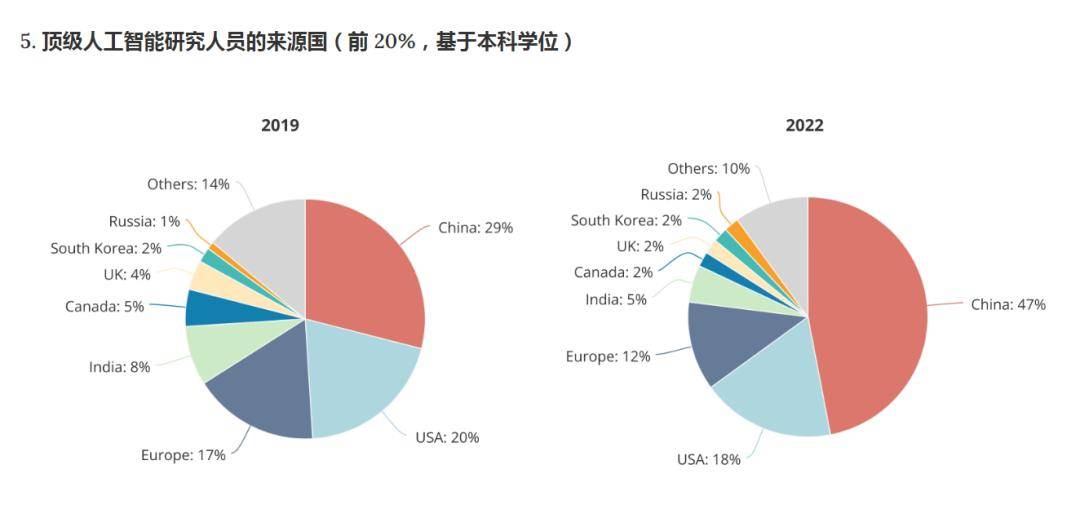 值得注意的是,《全球AI人才追踪报告2.0》做了一个数据对比,在中国国内工作的顶尖AI人才(位居全球前20%)比率,从2019年的11%攀升至2022年的28%。