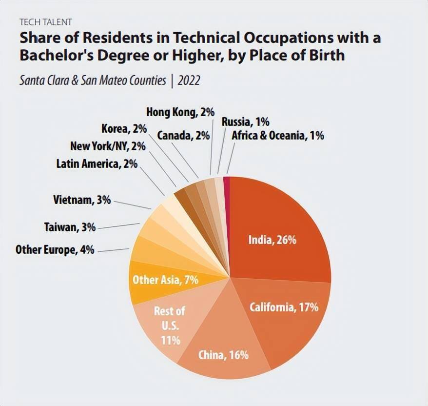 据美国硅谷联合投资公司(Joint Venture Silicon Valley)《2024硅谷指数》(Silicon Valley Index 2024),在硅谷从事技术类职业的人中,中国大陆出生的人才占16%。