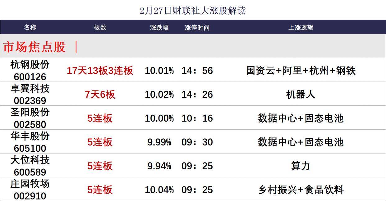 2月27日讯,今日77股涨停,12股炸板,封板率为86%,庄园牧场、华丰股份、大位科技、圣阳股份5连板,杭钢股份17天13板,雪龙集团3连板,卓翼科技7天6板,广聚能源9天6板,中大力德7天5板,诚邦股份7天4板,永茂泰、天成自控4天3板,夏厦精密6天3板,北交所万达轴承30CM2连板。沪深两市全天成交额2万亿,较上个交易日放量662亿。盘面上,主要集中在防御类板块,个股跌多涨少,全市场超3000只个股下跌。板块方面,海南自贸区、零售、食品、固态电池等板块涨幅居前,铜缆高速连接、国资云、CPO、软件开发等板块跌幅居前。截至收盘,沪指涨0.23%,深成指跌0.26%,创业板指跌0.52%。