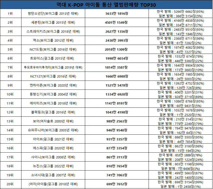 以截止到去年12月底的历代K-Pop艺人累计专辑销量TOP 20数据来看,便有BTS 、SEVENTEEN、Stray Kids等11组(含7人及以上)大型团位列其中,而精确到前五名则均为大型团。根据IFPI公布的去年全球畅销专辑实销榜显示,排名前20的畅销专辑便有10组来自于ENHYPEN、SEVENTEEN等K-Pop大型团。值得一提的是,J-Pop唯一上榜的Snow Man也同样为男子大型团配置。