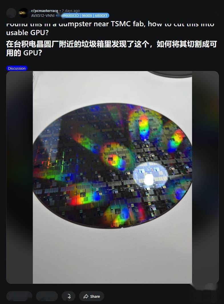 近日,一位 Reddit 用户 AVX512-VNNI 在台积电位于南京的 Fab 16 工厂附近的垃圾箱中意外发现了一片硅晶圆。这片晶圆是芯片制造的基础材料,而南京的 Fab 16 工厂主要生产 12 纳米及成熟工艺节点(如 16 纳米和 28 纳米)的芯片,而非那些先进工艺节点芯片,如 4 纳米、3 纳米,以及台积电将于今年下半年开始大规模生产的 2 纳米芯片。