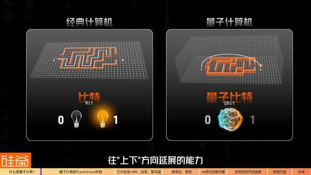 经典计算机中,所有信息都是用0和1表示的,就像二维平面上的生物,只能左右或前后移动;而量子计算机中,量子比特能够同时处于0和1的叠加态,还能与其他量子比特产生纠缠,这就像获得了往"上下"方向延展的能力。