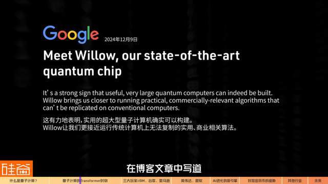 2024年12月9日,Google发布了新型量子芯片Willow。它只用不到5分钟便可以完成传统超级计算机需要1025年的标准基准的计算,震撼了整个科技界。