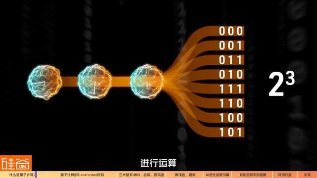 这种特性使得量子计算机可以同时对多种状态进行运算:假设有3个量子比特,由于叠加态的存在,它们可以同时表示8种(23)不同的状态;传统计算机则只能一个个处理。