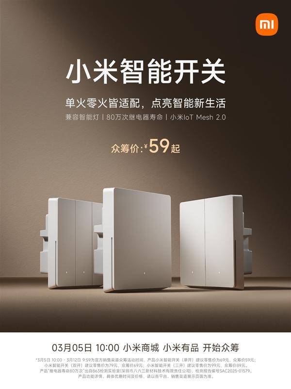 快科技3月5日消息,今天上午10点,小米智能开关正式开启众筹,众筹价59元起。