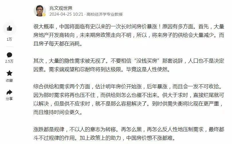 前两天在网络上看到的一个帖子,某高校经济学专业教授发文称:预计2025年房价将开始上涨,2026年将开始暴涨。