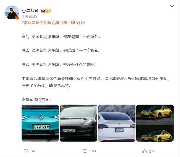 另一位汽车博主@-_-二师兄则贴出了英、德、美三国的新能源牌照的实车效果。他认为,中国新能源车牌这个渐变绿确实有点用力过猛,同时支持雷军的提案。