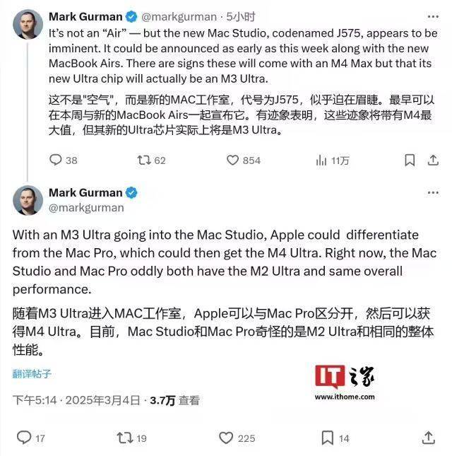 除了新 iPad 和 MacBook Air,古尔曼还爆料 新款 Mac Studio也将同期登场。