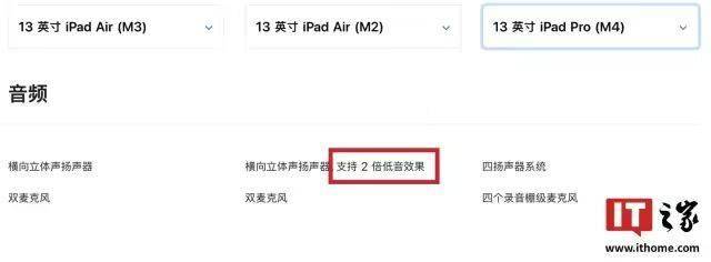 参考机型对比页,13 英寸款 M3 款 iPad Air平板电脑 取消了扬声器“2 倍低音效果”特性,而该特性实际上在上一代 M2 iPadAir 中才引入。