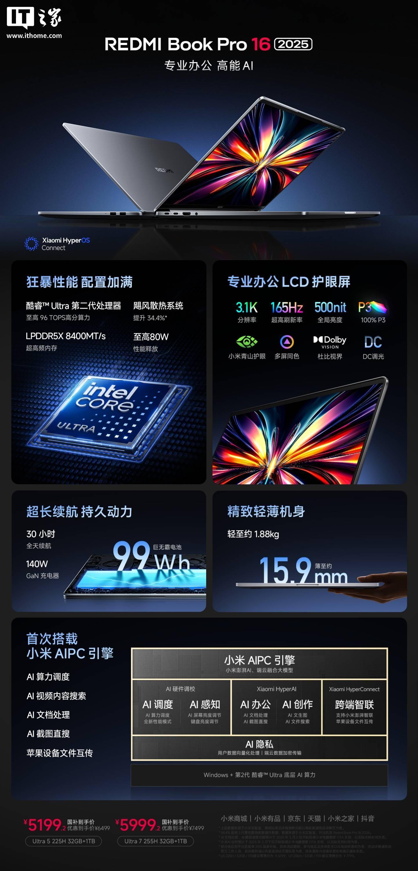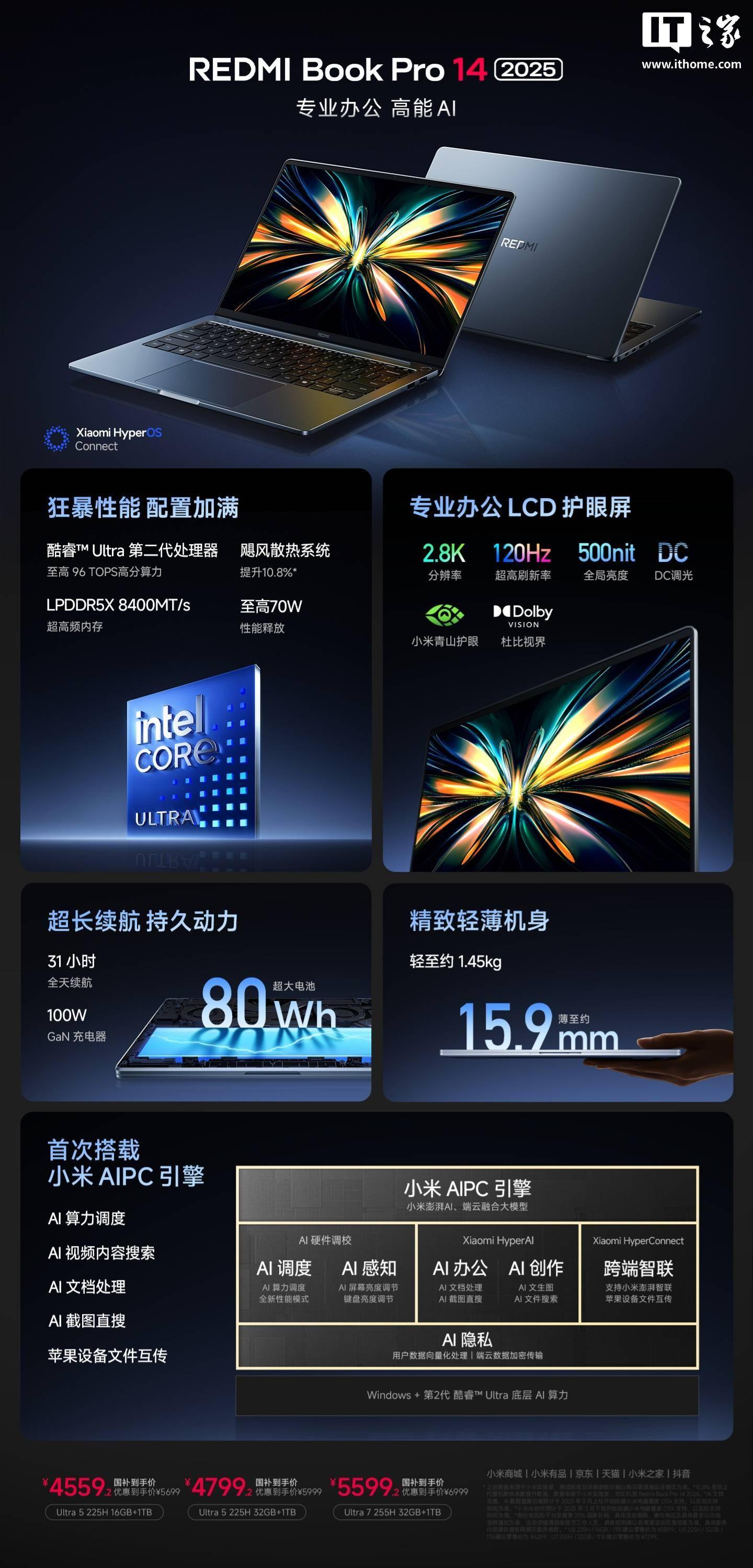据此前报道,在上月(2 月 27 日)的发布会上,小米推出了全新的 REDMI Book Pro 14 / 16 2025 笔记本电脑,首批搭载第二代英特尔酷睿 Ultra 处理器,首发价 5699 元起,叠加国补 4559.2 元起。