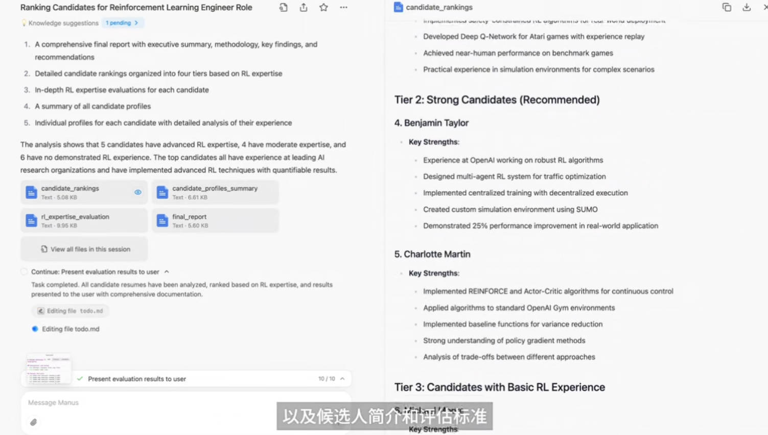 视频中又给了Manus 5份简历,在仔细阅读了所有的15份简历后,Manus提供了排名建议,以及候选人的简历和评估标准作为辅助材料。