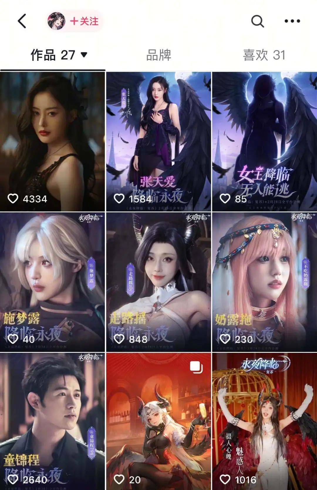 内容投放主要为垂直领域,都是为游戏领域达人和二次元领域拥有较高知名度的达人,目前抖音#永夜降临:复苏相关话题已经超过1亿次播放。