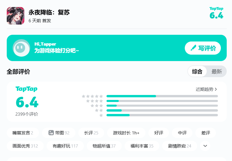用户口碑方面,截至3月5日《永夜降临:复苏》在TapTap评分为6.4分,玩家评论为2399条。