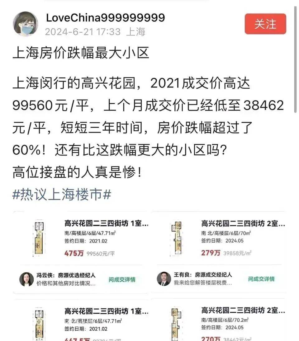 上海从事多年中介的网友说,三年前卖了两套总价400多万的房子,单价算下来都要9万+,到现在同样的房,却掉到了单价3.9万,拿着手上放几年,蒸发了60%。
