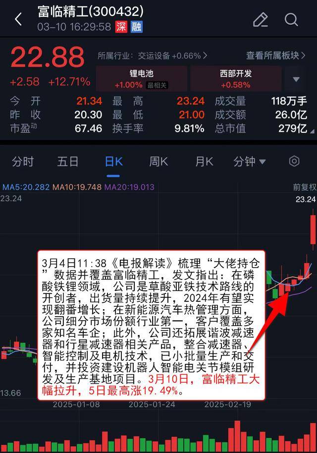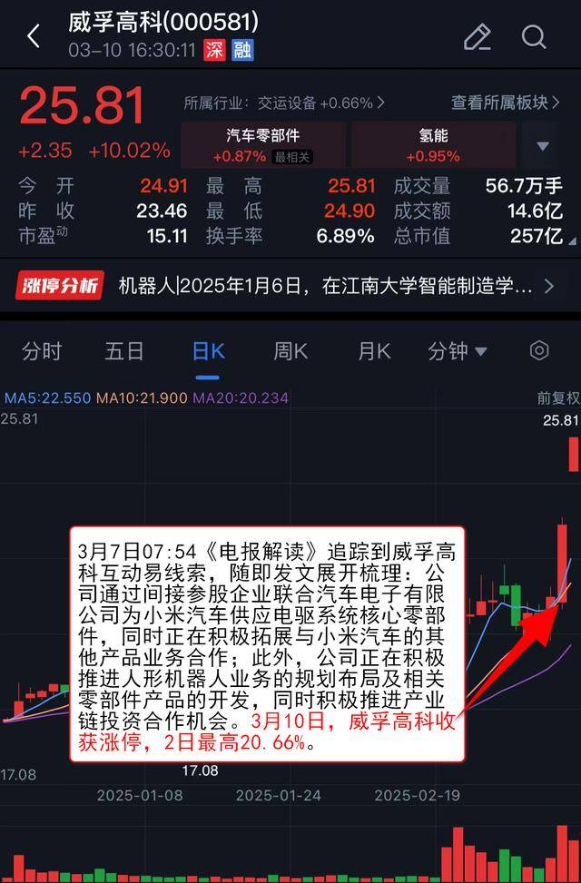 3月7日07:54《电报解读》 追踪到威孚高科互动易线索,随即发文展开梳理:公司通过间接参股企业联合汽车电子有限公司为小米汽车供应电驱系统核心零部件,同时正在积极拓展与小米汽车的其他产品业务合作;此外,公司正在积极推进人形机器人业务的规划布局及相关零部件产品的开发,同时积极推进产业链投资合作机会。3月10日,威孚高科收获涨停,2日最高20.66%。