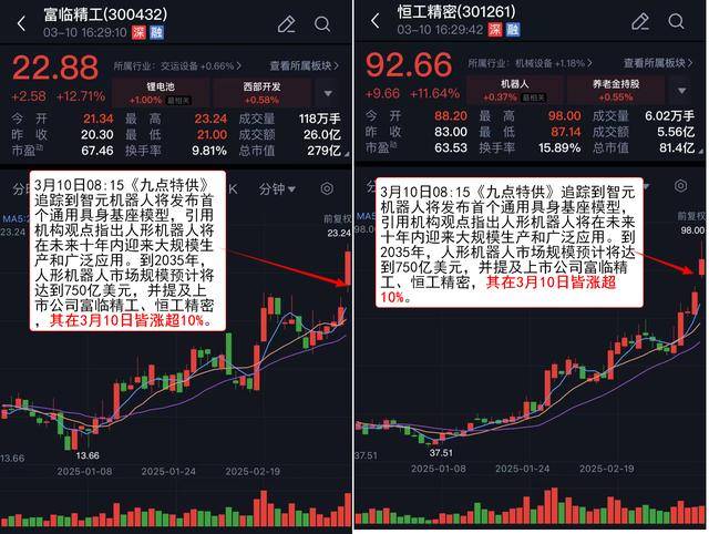 3月10日08:15《九点特供》 追踪到智元机器人将发布首个通用具身基座模型,引用机构观点指出人形机器人将在未来十年内迎来大规模生产和广泛应用。到2035年,人形机器人市场规模预计将达到750亿美元,并提及上市公司富临精工、恒工精密,其在3月10日皆涨超10%。
